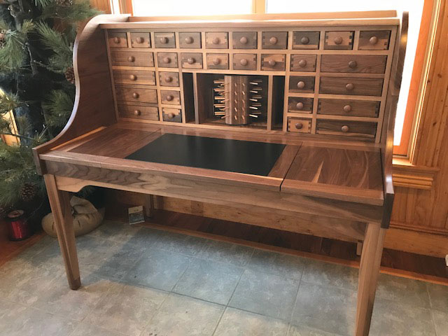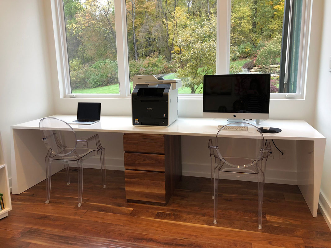 Brian was looking for a unique custom desk. Homestead created this modern Geometric hardwood desk for him in high gloss white. Each leg has unique angles and the desk is outfitted with a sap walnut natural filing cabinet. The desk measures 134” long by 32” deep and 30” high.