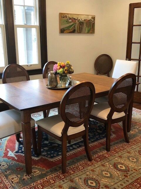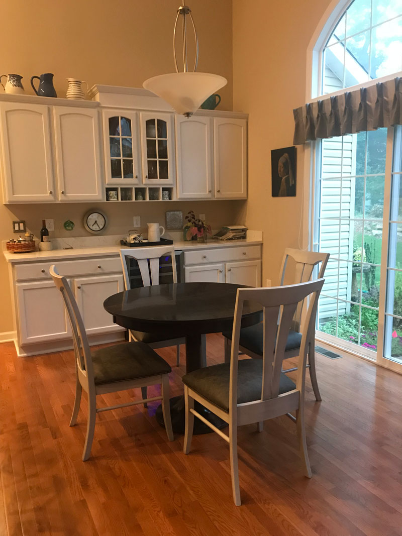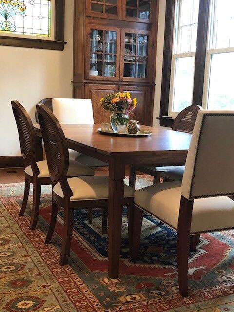 Chad was looking for a perfect dining table to fit in his space. Homestead created a 48" wide by 80" long custom maple hardwood table along with two custom nook storage benches. This dining set is accented with Windsor #10130 side chairs.