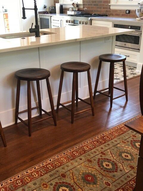We customized our Times Square Dining table for Laura and her family by adding burnishing and distressed details. It is made from rich hickory hardwood and measures 42” by 72” and comes with two 12” leaves for additional seating. Laura also selected our tapered 24” bar stools to help tie her spaces together beautifully.