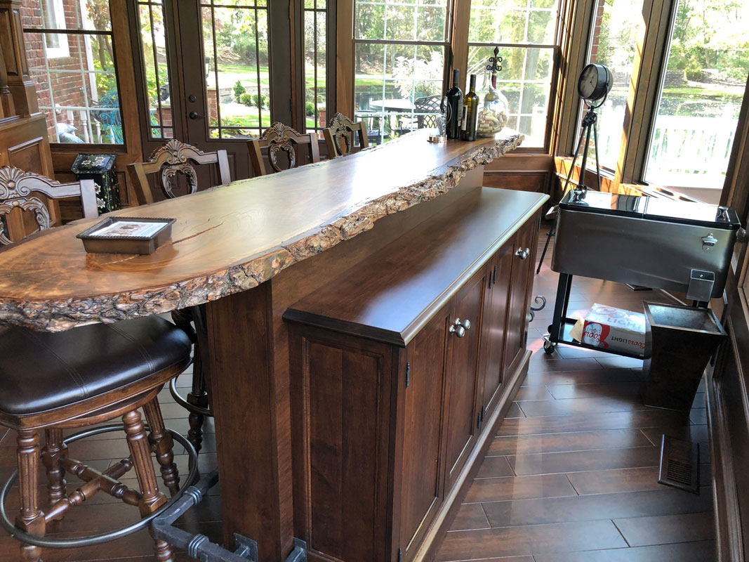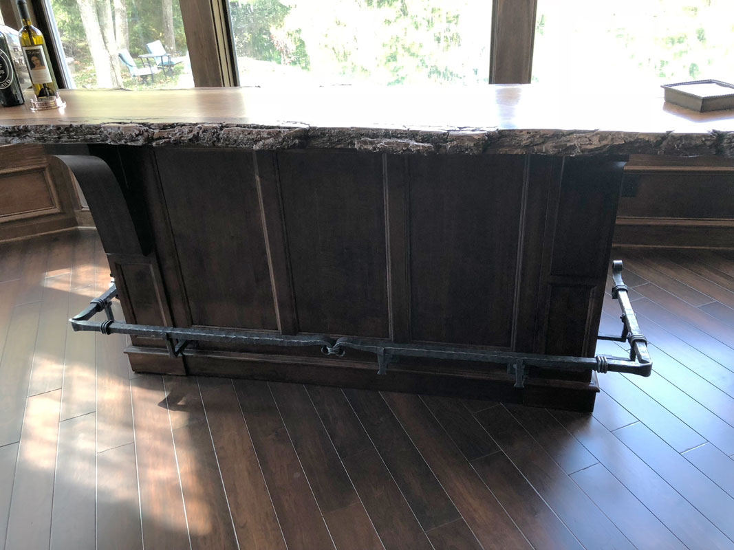 Lou and Brenda wanted a live-edge wooden bar for their home. Homestead constructed this stunning piece from the Gateway Tree, a state record black walnut tree from Missouri. The base of the bar features a rail that was handmade by a third generation blacksmith.