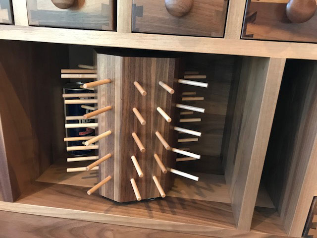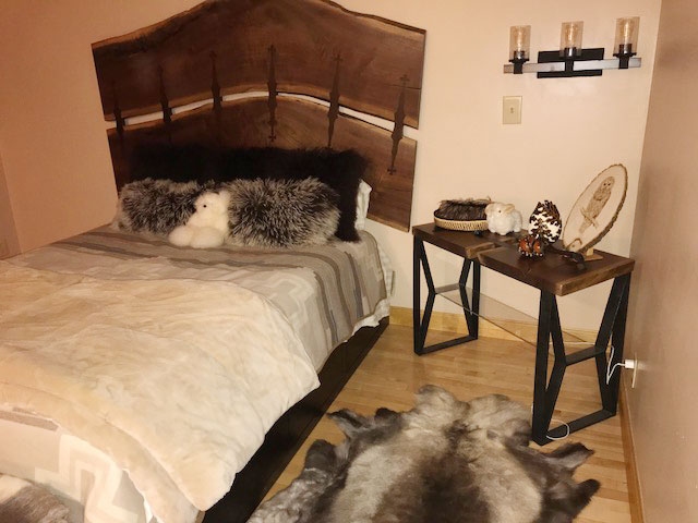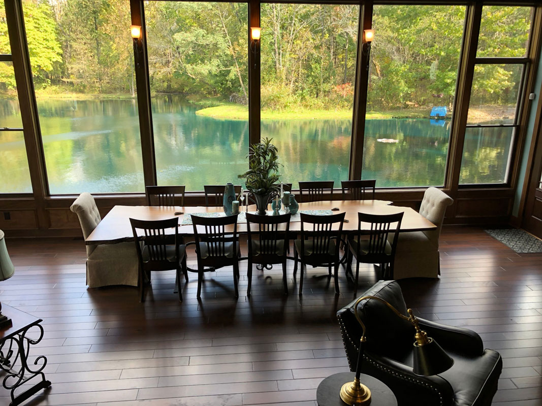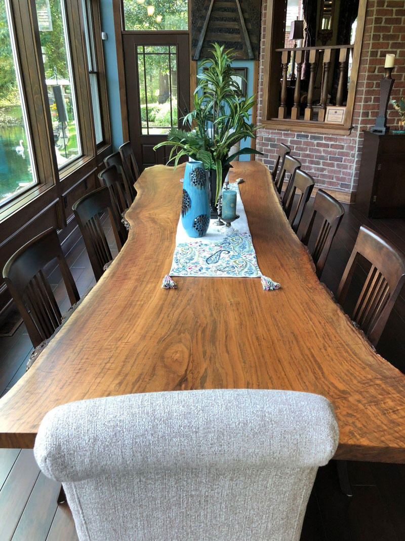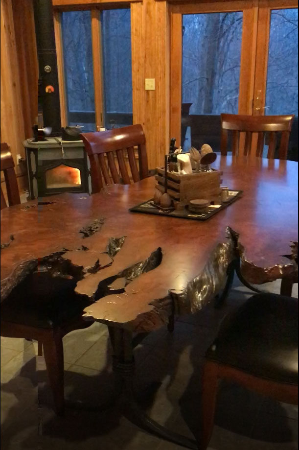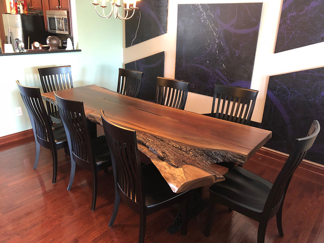 Homestead created this stunning custom dining table for Lou & Brenda from the same Gateway Tree (black walnut) that was used to construct their bar. The table is large enough to seat 12 guests comfortably and overlooks Lou & Brenda’s beautiful waterfront landscape. The base of the table is a custom Woodland base that was handmade by a third generation blacksmith and features a hand-hammered finish with a beeswax color. The wooden chairs surrounding the table are Homestead’s OW Shaker style.